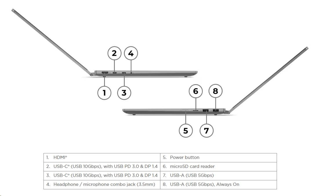 Standartné porty | 1x USB-A (USB 5Gbps / USB 3.2 Gen 1) 1x USB-A (USB 5Gbps / USB 3.2 Gen 1), Always On 2x USB-C® (USB 10Gbps / USB 3.2 Gen 2), with USB PD 3.0 and DisplayPort™ 1.4 1x HDMI® 2.1, up to 4K/60Hz 1x Headphone / microphone combo jack (3.5mm) 1x microSD card reader |