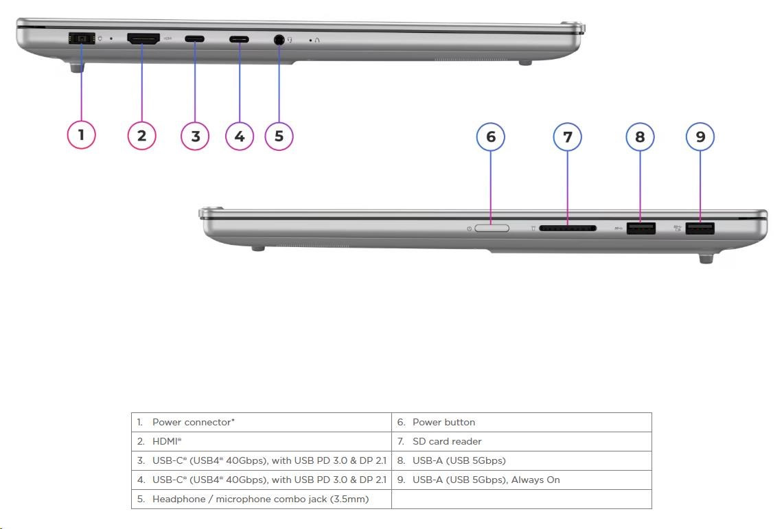 | Standartné porty | 1x USB-A (USB 5Gbps / USB 3.2 Gen 1) 1x USB-A (USB 5Gbps / USB 3.2 Gen 1), Always On 2x USB-C® (USB4® 40Gbps), with USB PD 3.0 and DisplayPort™ 2.1 1x HDMI® 2.1, up to 8K/60Hz 1x Headphone / microphone combo jack (3.5mm) 1x SD card reader Optional Ports (configured) 1x Power Connector |