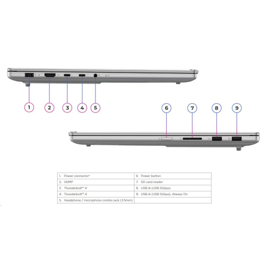 | Standartné porty | 1x USB-A (USB 5Gbps / USB 3.2 Gen 1) 1x USB-A (USB 5Gbps / USB 3.2 Gen 1), Always On 2x USB-C® (Thunderbolt™ 4 / USB4® 40Gbps), with USB PD 3.0 and DisplayPort™ 2.1 1x HDMI® 2.1, up to 8K/60Hz 1x Headphone / microphone combo jack (3.5mm) 1x SD card reader |