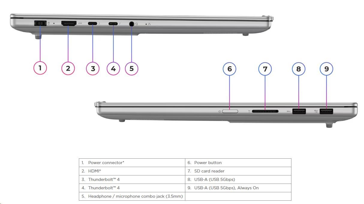 | Standartné porty | 1x USB-A (USB 5Gbps / USB 3.2 Gen 1) 1x USB-A (USB 5Gbps / USB 3.2 Gen 1), Always On 2x USB-C® (Thunderbolt™ 4 / USB4® 40Gbps), with USB PD 3.0 and DisplayPort™ 2.1 1x HDMI® 2.1, up to 8K/60Hz 1x Headphone / microphone combo jack (3.5mm) 1x SD card reader |