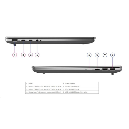 | Standartné porty | 1x USB-A (USB 5Gbps / USB 3.2 Gen 1) 1x USB-A (USB 5Gbps / USB 3.2 Gen 1), Always On 2x USB-C® (USB 5Gbps / USB 3.2 Gen 1), with USB PD 3.0 and DisplayPort™ 1.4 1x HDMI® 2.1, up to 4K/60Hz 1x Headphone / microphone combo jack (3.5mm) 1x microSD card reader |