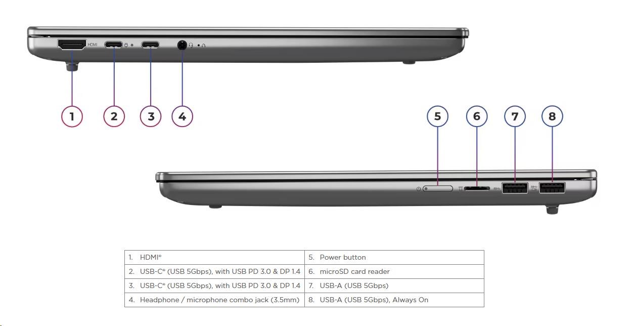 | Standartné porty | 1x USB-A (USB 5Gbps / USB 3.2 Gen 1) 1x USB-A (USB 5Gbps / USB 3.2 Gen 1), Always On 2x USB-C® (USB 5Gbps / USB 3.2 Gen 1), with USB PD 3.0 and DisplayPort™ 1.4 1x HDMI® 2.1, up to 4K/60Hz 1x Headphone / microphone combo jack (3.5mm) 1x microSD card reader |