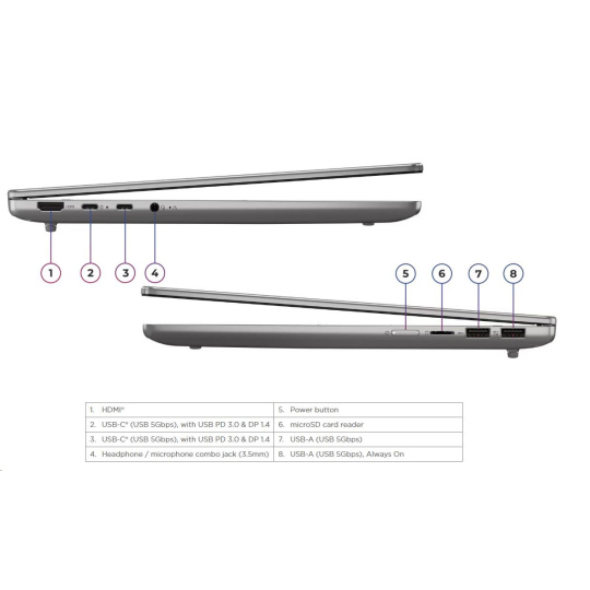 | Standartné porty | 1x USB-A (USB 5Gbps / USB 3.2 Gen 1) 1x USB-A (USB 5Gbps / USB 3.2 Gen 1), Always On 2x USB-C® (USB 5Gbps / USB 3.2 Gen 1), with USB PD 3.0 and DisplayPort™ 1.4 1x HDMI® 1.4b 1x Headphone / microphone combo jack (3.5mm) 1x microSD card reader |