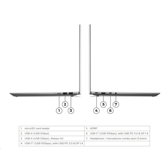 | Standartné porty | 1x USB-A (USB 5Gbps / USB 3.2 Gen 1) 1x USB-A (USB 5Gbps / USB 3.2 Gen 1), Always On 2x USB-C® (USB 10Gbps / USB 3.2 Gen 2), with USB PD 3.0 and DisplayPort™ 1.4 1x HDMI® 2.1, up to 4K/60Hz 1x Headphone / microphone combo jack (3.5mm) 1x microSD card reader |