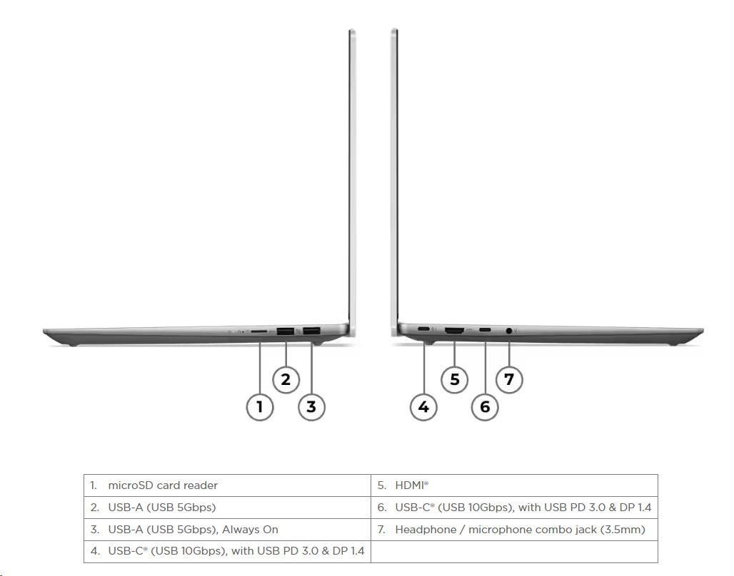 | Standartné porty | 1x USB-A (USB 5Gbps / USB 3.2 Gen 1) 1x USB-A (USB 5Gbps / USB 3.2 Gen 1), Always On 2x USB-C® (USB 10Gbps / USB 3.2 Gen 2), with USB PD 3.0 and DisplayPort™ 1.4 1x HDMI® 2.1, up to 4K/60Hz 1x Headphone / microphone combo jack (3.5mm) 1x microSD card reader |