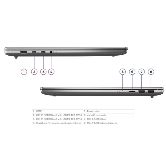 | Standartné porty | 1x USB-A (USB 5Gbps / USB 3.2 Gen 1) 1x USB-A (USB 5Gbps / USB 3.2 Gen 1), Always On 2x USB-C® (USB 10Gbps / USB 3.2 Gen 2), with USB PD 3.0 and DisplayPort™ 1.4 1x HDMI® 2.1, up to 4K/60Hz 1x Headphone / microphone combo jack (3.5mm) 1x microSD card reader |