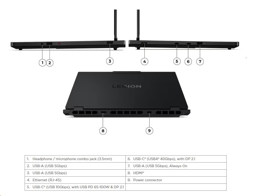 Standartné porty | 2x USB-A (USB 5Gbps / USB 3.2 Gen 1) 1x USB-A (USB 5Gbps / USB 3.2 Gen 1), Always On 1x USB-C® (USB 10Gbps / USB 3.2 Gen 2), with USB PD 65-100W and DisplayPort™ 2.1 1x USB-C® (USB4® 40Gbps), with DP 2.1 1x HDMI® 2.1, up to 8K/60Hz 1x Headphone / microphone combo jack (3.5mm) 1x Ethernet (RJ-45) 1x Power connector |