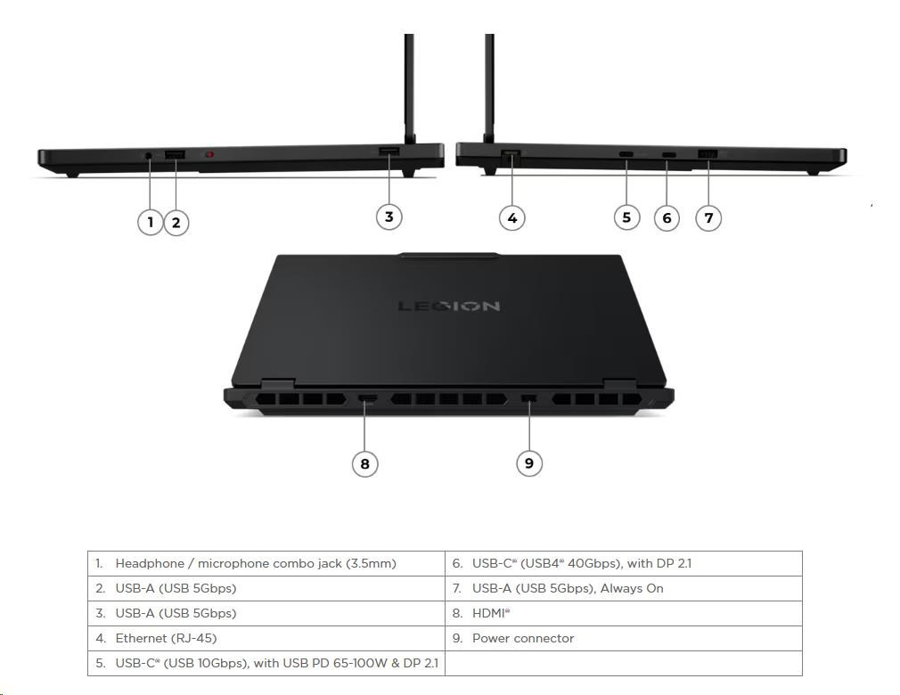 | Standartné porty | 2x USB-A (USB 5Gbps / USB 3.2 Gen 1) 1x USB-A (USB 5Gbps / USB 3.2 Gen 1), Always On 1x USB-C® (USB 10Gbps / USB 3.2 Gen 2), with USB PD 65-100W and DisplayPort™ 2.1 1x USB-C® (USB4® 40Gbps), with DP 2.1 1x HDMI® 2.1, up to 8K/60Hz 1x Headphone / microphone combo jack (3.5mm) 1x Ethernet (RJ-45) 1x Power connector |