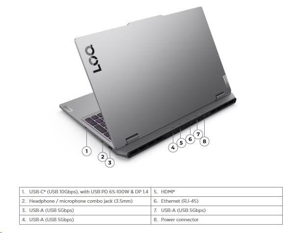| Standartné porty | 3x USB-A (USB 5Gbps / USB 3.2 Gen 1) 1x USB-C® (USB 10Gbps / USB 3.2 Gen 2), with USB PD 65-100W and DisplayPort™ 1.4 1x HDMI® 2.1, up to 8K/60Hz 1x Headphone / microphone combo jack (3.5mm) 1x Ethernet (RJ-45) 1x Power connector |