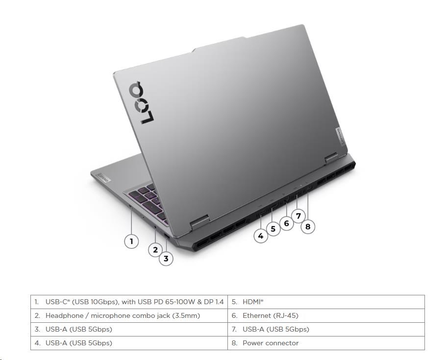 | Standartné porty | 3x USB-A (USB 5Gbps / USB 3.2 Gen 1) 1x USB-C® (USB 10Gbps / USB 3.2 Gen 2), with USB PD 65-100W and DisplayPort™ 1.4 1x HDMI® 2.1, up to 8K/60Hz 1x Headphone / microphone combo jack (3.5mm) 1x Ethernet (RJ-45) 1x Power connector |