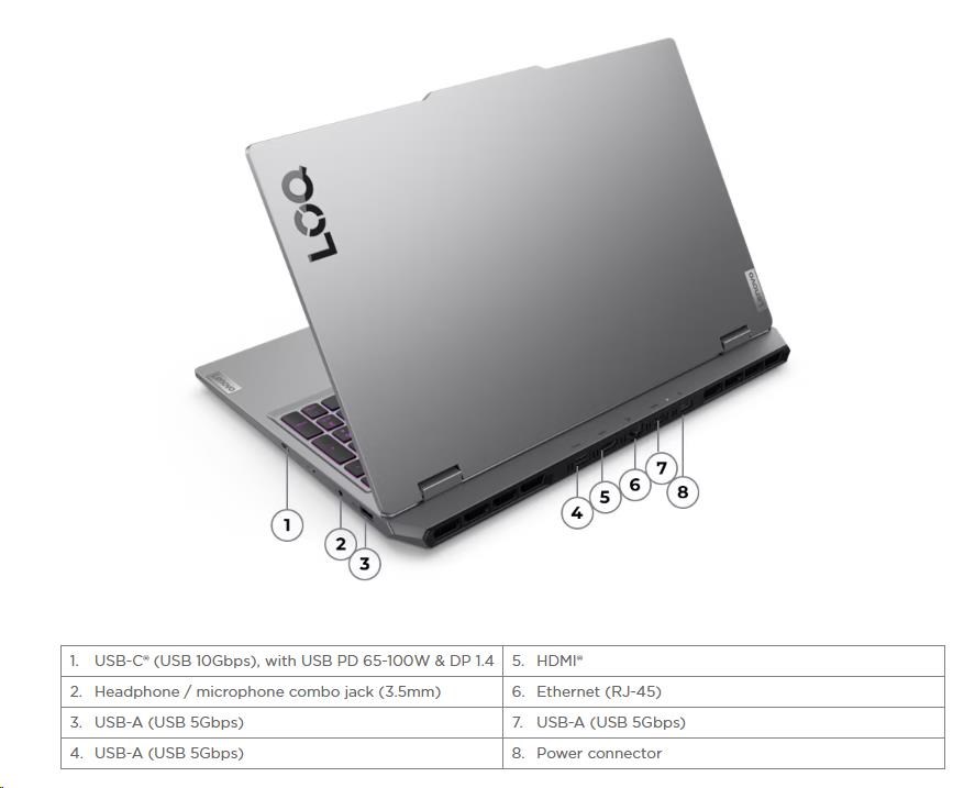 | Standartné porty | 3x USB-A (USB 5Gbps / USB 3.2 Gen 1) 1x USB-C® (USB 10Gbps / USB 3.2 Gen 2), with USB PD 65-100W and DisplayPort™ 1.4 1x HDMI® 2.1, up to 8K/60Hz 1x Headphone / microphone combo jack (3.5mm) 1x Ethernet (RJ-45) 1x Power connector |
