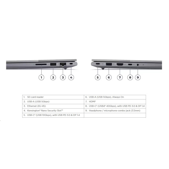| Standartné porty | 1x USB-A (USB 5Gbps / USB 3.2 Gen 1) 1x USB-A (USB 5Gbps / USB 3.2 Gen 1), Always On 1x USB-C® (USB 10Gbps / USB 3.2 Gen 2), with USB PD 3.0 and DisplayPort™ 1.4 1x USB-C® (USB4® 40Gbps), with USB PD 3.0 and DisplayPort™ 1.4 1x HDMI® 2.1, up to 4K/60Hz 1x Headphone / microphone combo jack (3.5mm) 1x Ethernet (RJ-45) 1x SD card reader |