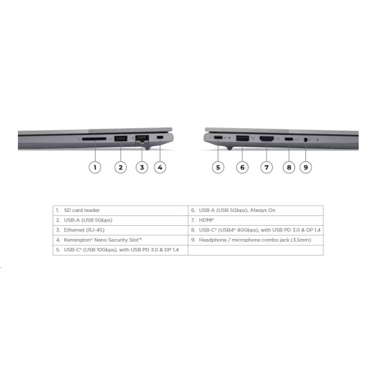 | Standartné porty | 1x USB-A (USB 5Gbps / USB 3.2 Gen 1) 1x USB-A (USB 5Gbps / USB 3.2 Gen 1), Always On 1x USB-C® (USB 10Gbps / USB 3.2 Gen 2), with USB PD 3.0 and DisplayPort™ 1.4 1x USB-C® (USB4® 40Gbps), with USB PD 3.0 and DisplayPort™ 1.4 1x HDMI® 2.1, up to 4K/60Hz 1x Headphone / microphone combo jack (3.5mm) 1x Ethernet (RJ-45) 1x SD card reader |