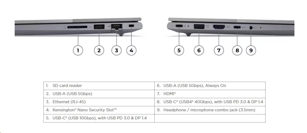 | Standartné porty | 1x USB-A (USB 5Gbps / USB 3.2 Gen 1) 1x USB-A (USB 5Gbps / USB 3.2 Gen 1), Always On 1x USB-C® (USB 10Gbps / USB 3.2 Gen 2), with USB PD 3.0 and DisplayPort™ 1.4 1x USB-C® (USB4® 40Gbps), with USB PD 3.0 and DisplayPort™ 1.4 1x HDMI® 2.1, up to 4K/60Hz 1x Headphone / microphone combo jack (3.5mm) 1x Ethernet (RJ-45) 1x SD card reader |