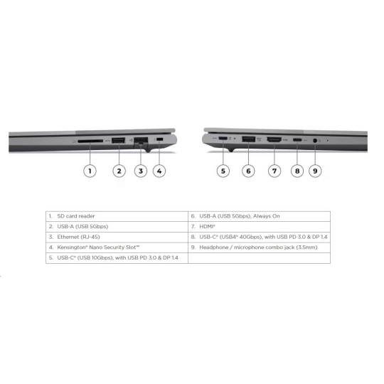 | Standartné porty | 1x USB-A (USB 5Gbps / USB 3.2 Gen 1) 1x USB-A (USB 5Gbps / USB 3.2 Gen 1), Always On 1x USB-C® (USB 10Gbps / USB 3.2 Gen 2), with USB PD 3.0 and DisplayPort™ 1.4 1x USB-C® (USB4® 40Gbps), with USB PD 3.0 and DisplayPort™ 1.4 1x HDMI® 2.1, up to 4K/60Hz 1x Headphone / microphone combo jack (3.5mm) 1x Ethernet (RJ-45) 1x SD card reader |