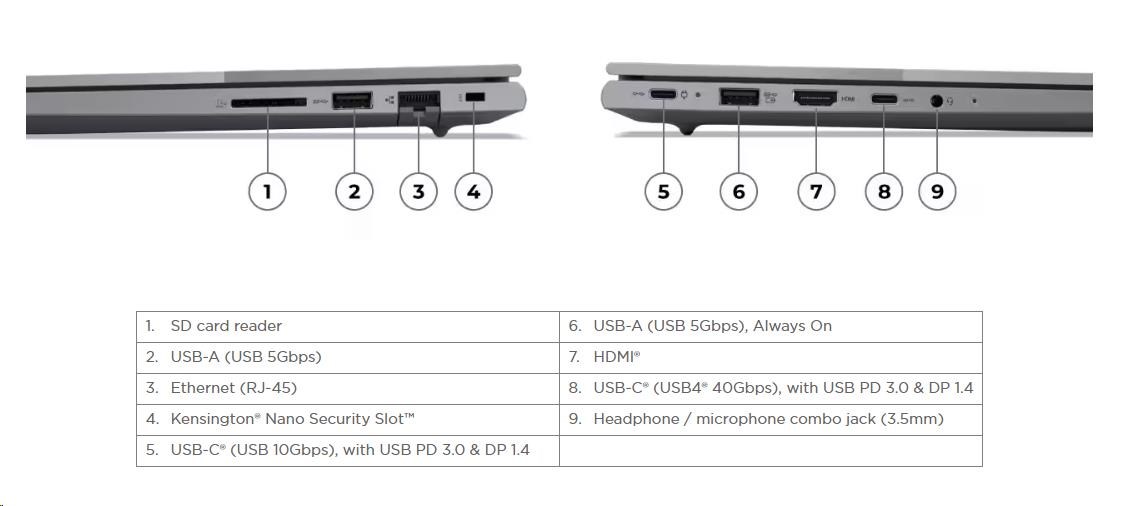 | Standartné porty | 1x USB-A (USB 5Gbps / USB 3.2 Gen 1) 1x USB-A (USB 5Gbps / USB 3.2 Gen 1), Always On 1x USB-C® (USB 10Gbps / USB 3.2 Gen 2), with USB PD 3.0 and DisplayPort™ 1.4 1x USB-C® (USB4® 40Gbps), with USB PD 3.0 and DisplayPort™ 1.4 1x HDMI® 2.1, up to 4K/60Hz 1x Headphone / microphone combo jack (3.5mm) 1x Ethernet (RJ-45) 1x SD card reader |