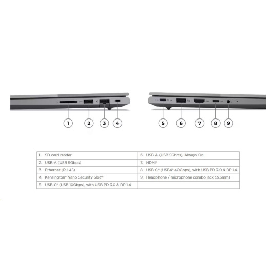 | Standartné porty | 1x USB-A (USB 5Gbps / USB 3.2 Gen 1) 1x USB-A (USB 5Gbps / USB 3.2 Gen 1), Always On 1x USB-C® (USB 10Gbps / USB 3.2 Gen 2), with USB PD 3.0 and DisplayPort™ 1.4 1x USB-C® (USB4® 40Gbps), with USB PD 3.0 and DisplayPort™ 1.4 1x HDMI® 2.1, up to 4K/60Hz 1x Headphone / microphone combo jack (3.5mm) 1x Ethernet (RJ-45) 1x SD card reader |