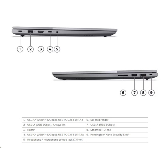 | Standartné porty | 1x USB-A (USB 5Gbps), Always On 1x USB-A (USB 5Gbps) 2x USB-C® (USB4® 40Gbps), with USB PD 3.0 and DisplayPort™ 1.4a 1x HDMI® 2.1, up to 4K/60Hz 1x Headphone / microphone combo jack (3.5mm) 1x Ethernet (RJ-45) 1x SD card reader |