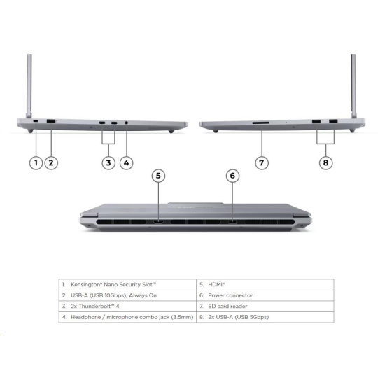 | Standartné porty | 2x USB-A (USB 5Gbps / USB 3.2 Gen 1) 1x USB-A (USB 10Gbps / USB 3.2 Gen 2), Always On 2x USB-C® (Thunderbolt™ 4 / USB4® 40Gbps), with USB PD 3.0 and DisplayPort™ 2.1 1x HDMI® 2.1, up to 8K/60Hz 1x Headphone / microphone combo jack (3.5mm) 1x SD card reader 1x Magic Bay (pogo pin connector) 1x Power connector |