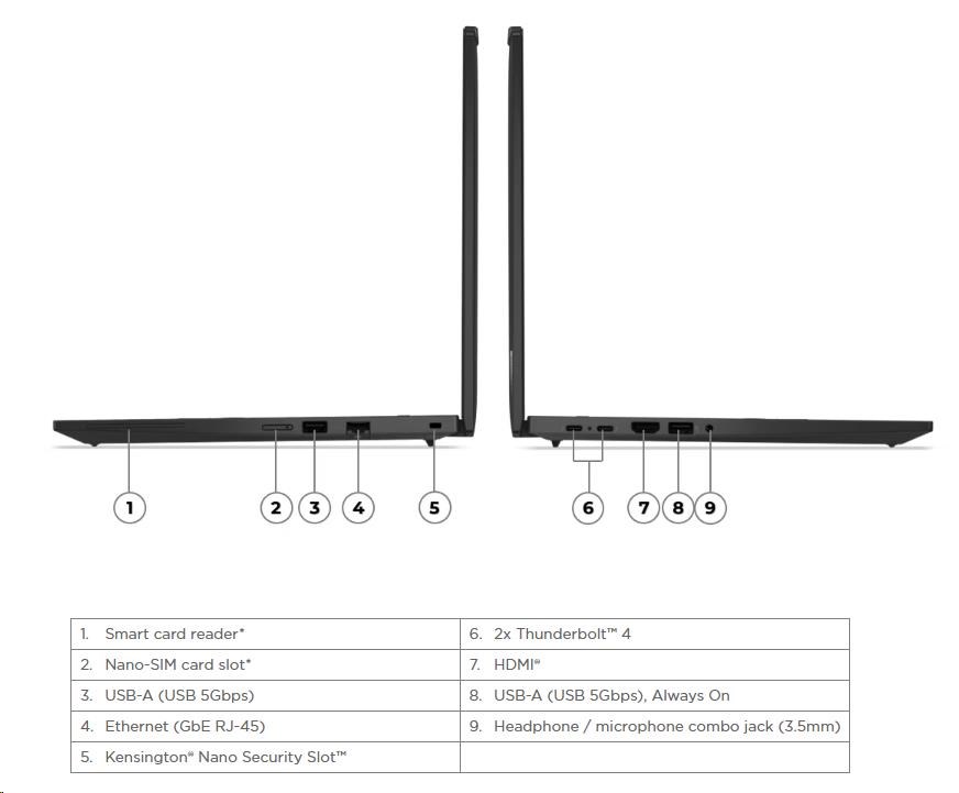 | Standartné porty | 1x USB-A (USB 5Gbps / USB 3.2 Gen 1) 1x USB-A (USB 5Gbps / USB 3.2 Gen 1), Always On 2x USB-C® (Thunderbolt™ 4 / USB4® 40Gbps), with PD 3.0 and DisplayPort™ 1.4 1x HDMI® 2.1, up to 4K/60Hz 1x Headphone / microphone combo jack (3.5mm) 1x Ethernet (RJ-45) 1x Security keyhole |