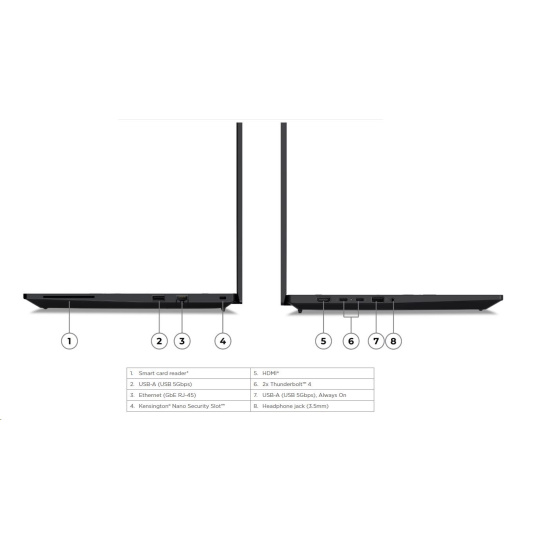 | Standartné porty | 1x USB-A (USB 5Gbps / USB 3.2 Gen 1) 1x USB-A (USB 5Gbps / USB 3.2 Gen 1), Always On 2x Thunderbolt™ 4, with USB PD 3.0 1x HDMI® 2.1, up to 4K/60Hz 1x Headphone / microphone combo jack (3.5mm) 1x Ethernet (GbE RJ-45) 1x Security keyhole 1x Smart Card Reader |