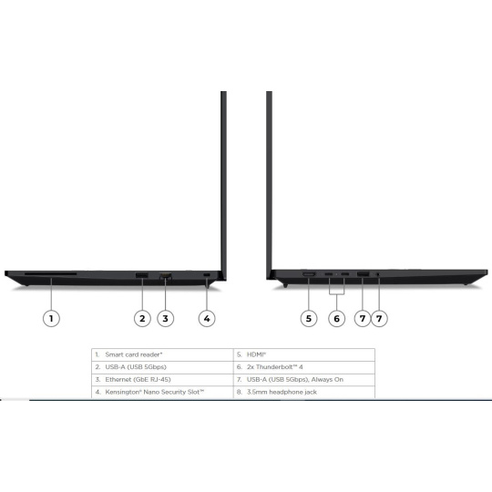 | Standartné porty | 1x USB-A (USB 5Gbps / USB 3.2 Gen 1) 1x USB-A (USB 5Gbps / USB 3.2 Gen 1), Always On 2x USB-C® (Thunderbolt™ 4 / USB4® 40Gbps), with USB PD 3.0 and DisplayPort™ 2.1 1x HDMI® 2.1, up to 4K/60Hz 1x Headphone / microphone combo jack (3.5mm) 1x Ethernet (RJ-45) 1x Security keyhole |