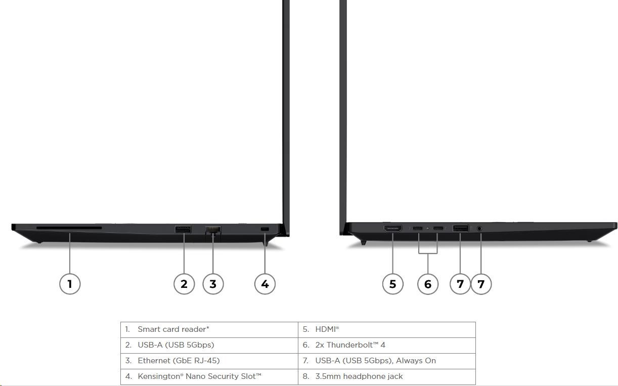 | Standartné porty | 1x USB-A (USB 5Gbps / USB 3.2 Gen 1) 1x USB-A (USB 5Gbps / USB 3.2 Gen 1), Always On 2x USB-C® (Thunderbolt™ 4 / USB4® 40Gbps), with USB PD 3.0 and DisplayPort™ 2.1 1x HDMI® 2.1, up to 4K/60Hz 1x Headphone / microphone combo jack (3.5mm) 1x Ethernet (RJ-45) 1x Security keyhole |