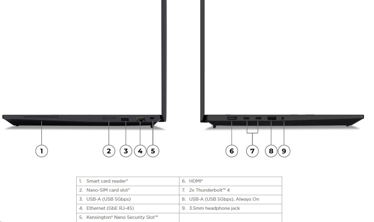 Standartné porty | 1x USB-A (USB 5Gbps / USB 3.2 Gen 1) 1x USB-A (USB 5Gbps / USB 3.2 Gen 1), Always On 2x USB-C® (Thunderbolt™ 4 / USB4® 40Gbps), with USB PD 3.0 and DisplayPort™ 2.1 1x HDMI® 2.1, up to 4K/60Hz 1x Headphone / microphone combo jack (3.5mm) 1x Ethernet (RJ-45) 1x Security keyhole |