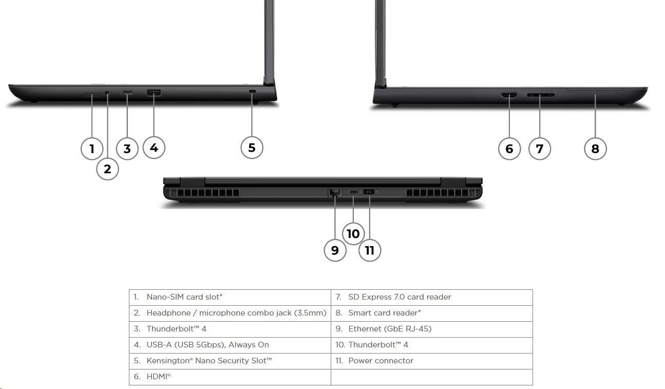 | Standartné porty | 1x USB-A (USB 5Gbps / USB 3.2 Gen 1), Always On 2x USB-C® (Thunderbolt™ 4 / USB4® 40Gbps), with USB PD 3.0 and DisplayPort™ 2.1 1x HDMI® 2.1, up to 8K/60Hz 1x Headphone / microphone combo jack (3.5mm) 1x Ethernet (RJ-45) 1x SD Express 7.0 card reader 1x Security keyhole |