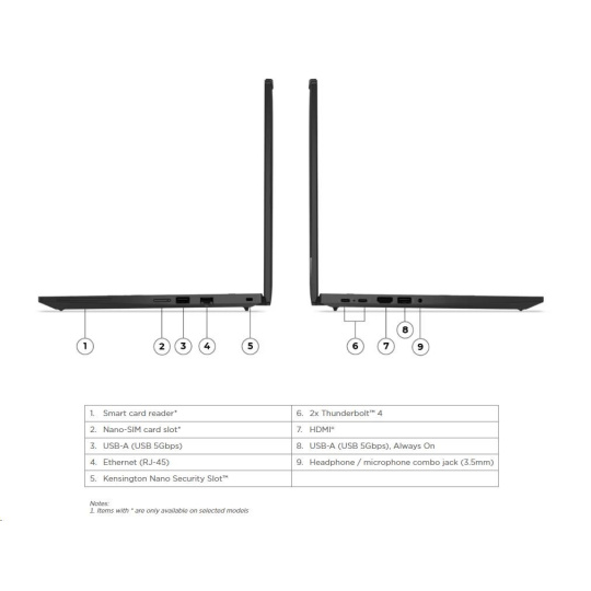 | Standartné porty | 1x USB-A (USB 5Gbps / USB 3.2 Gen 1) 1x USB-A (USB 5Gbps / USB 3.2 Gen 1), Always On 2x USB-C® (Thunderbolt™ 4 / USB4® 40Gbps), with USB PD 3.0 and DisplayPort™ 2.1 1x HDMI® 2.1, up to 4K/60Hz 1x Headphone / microphone combo jack (3.5mm) 1x Ethernet (RJ-45) Optional Ports (configured) 1x Smart Card Reader 1x Nano-SIM Card Slot |