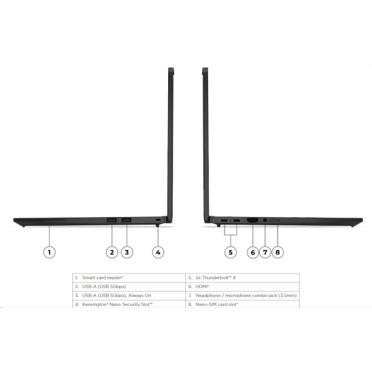 | Standartné porty | 1x USB-A (USB 5Gbps / USB 3.2 Gen 1) 1x USB-A (USB 5Gbps / USB 3.2 Gen 1), Always On 2x USB-C® (Thunderbolt™ 4 / USB4® 40Gbps), with USB PD 3.0 and DisplayPort™ 2.1 1x HDMI® 2.1, up to 4K/60Hz 1x Headphone / microphone combo jack (3.5mm) |