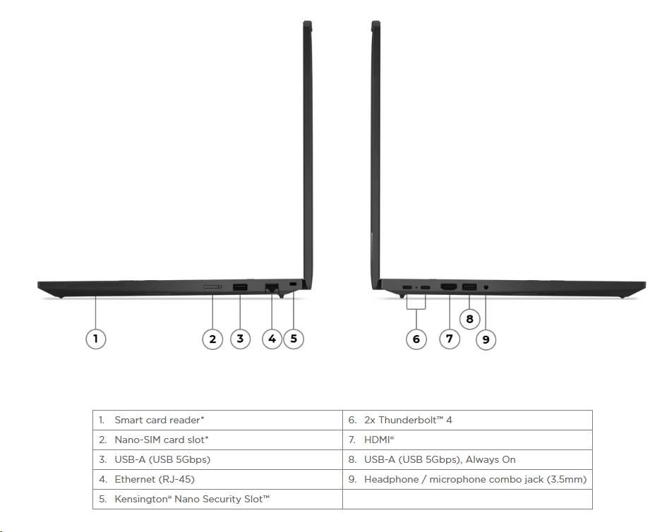 | Standartné porty | 1x USB-A (USB 5Gbps / USB 3.2 Gen 1) 1x USB-A (USB 5Gbps / USB 3.2 Gen 1), Always On 2x USB-C® (Thunderbolt™ 4 / USB4® 40Gbps), with USB PD 3.0 and DisplayPort™ 2.1 1x HDMI® 2.1, up to 4K/60Hz 1x Headphone / microphone combo jack (3.5mm) 1x Ethernet (RJ-45) |