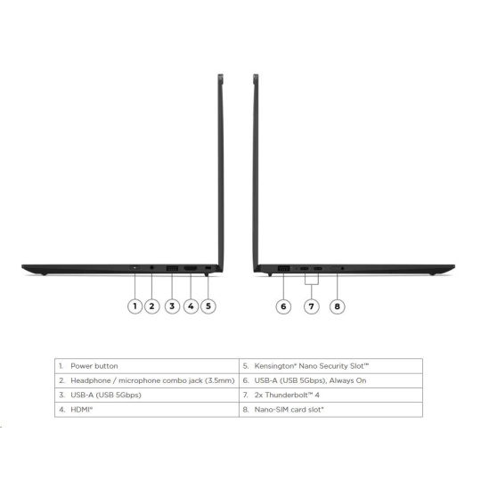 | Standartné porty | 1x USB-A (USB 5Gbps / USB 3.2 Gen 1) 1x USB-A (USB 5Gbps / USB 3.2 Gen 1), Always On 2x USB-C® (Thunderbolt™ 4 / USB4® 40Gbps), with USB PD 3.0 and DisplayPort™ 2.1 1x HDMI® 2.1, up to 4K/60Hz 1x Headphone / microphone combo jack (3.5mm) 1x Nano-SIM Card Slot |
