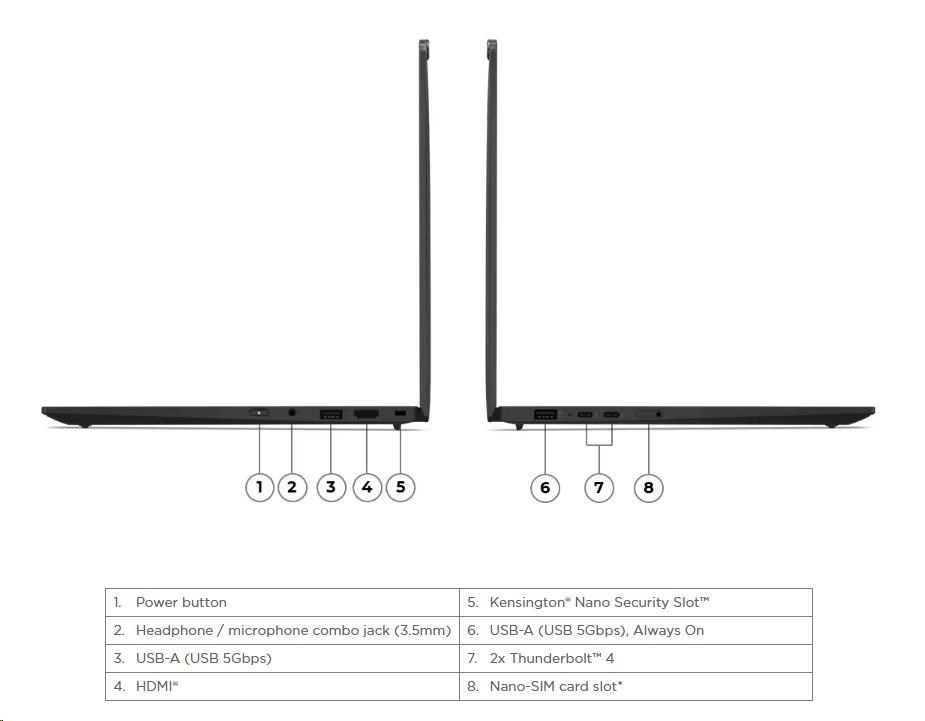 | Standartné porty | 1x USB-A (USB 5Gbps / USB 3.2 Gen 1) 1x USB-A (USB 5Gbps / USB 3.2 Gen 1), Always On 2x USB-C® (Thunderbolt™ 4 / USB4® 40Gbps), with USB PD 3.0 and DisplayPort™ 2.1 1x HDMI® 2.1, up to 4K/60Hz 1x Headphone / microphone combo jack (3.5mm) 1x Nano-SIM Card Slot |