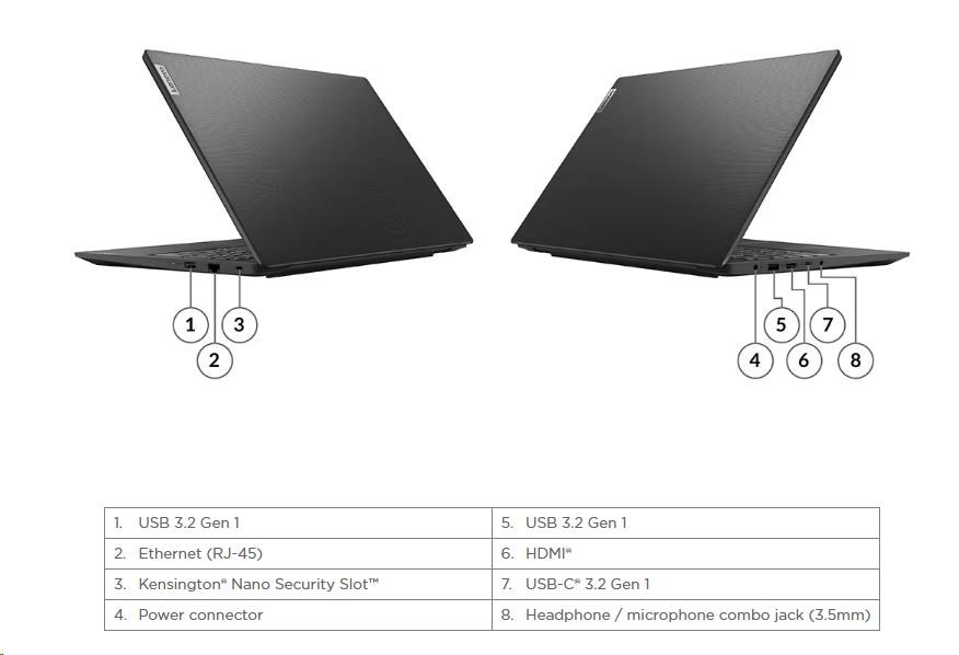 | Standartné porty | 2x USB 3.2 Gen 1 1x USB-C® 3.2 Gen 1 (support data transfer, Power Delivery (20V only) and DisplayPort™ 1.2) 1x HDMI® 1.4b 1x Headphone / microphone combo jack (3.5mm) 1x Ethernet (RJ-45) 1x Power connector |