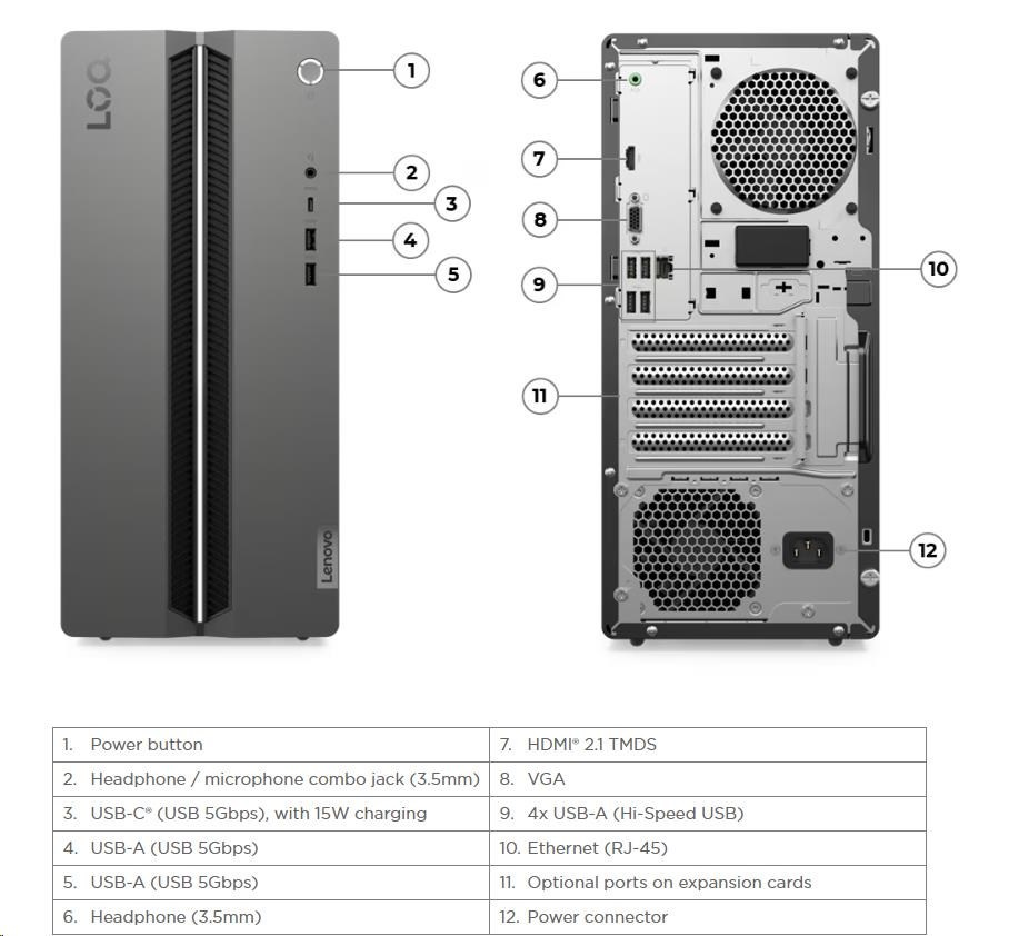 | Zadné porty | 4x USB-A (Hi-Speed USB / USB 2.0) 1x HDMI® 2.1 TMDS 1x VGA 1x Ethernet (RJ-45) 1x headphone (3.5mm) 1x power connector |