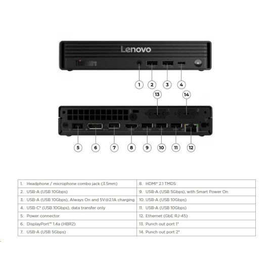 | Predné porty | 1x USB-C® (USB 10Gbps / USB 3.2 Gen 2), data transfer only 2x USB-A (USB 10Gbps / USB 3.2 Gen 2), one supports Always On and 5V@2.1A charging 1x headphone / microphone combo jack (3.5mm) |