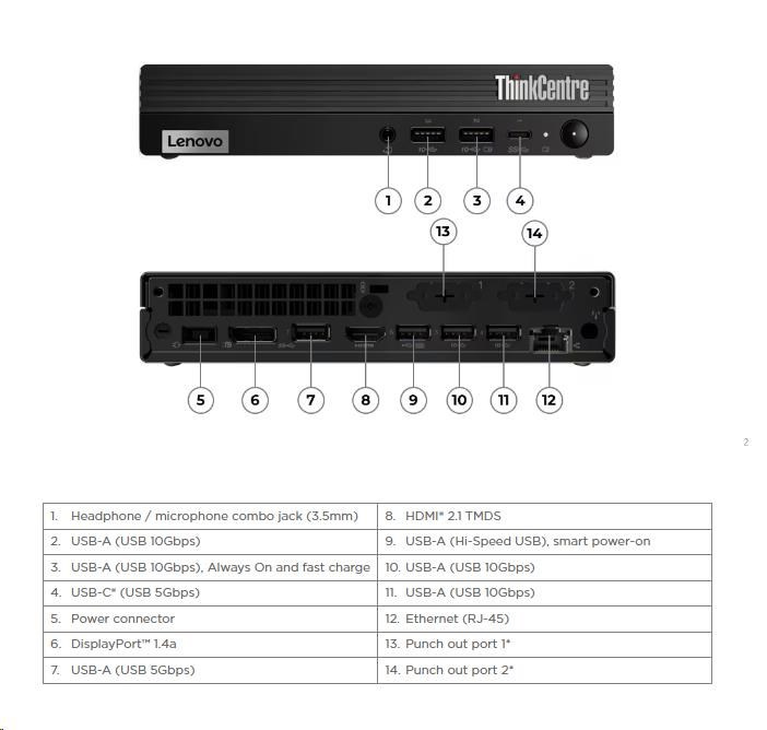 | Predné porty | 1x USB-C® (USB 5Gbps / USB 3.2 Gen 1), with 5V@0.9A charging 1x USB-A (USB 10Gbps / USB 3.2 Gen 2), with Always On and 5V@2.1A charging 1x USB-A (USB 10Gbps / USB 3.2 Gen 2) 1x headphone / microphone combo jack (3.5mm) |