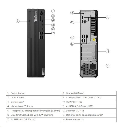 | Predné porty | 1x USB-C® (USB 5Gbps / USB 3.2 Gen 1), with 15W charging 4x USB-A (USB 5Gbps / USB 3.2 Gen 1) 1x headphone (3.5mm) 1x headphone / microphone combo jack (3.5mm) |