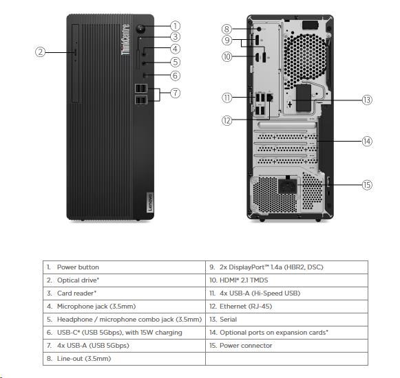 Predné porty | 1x USB-C® (USB 5Gbps / USB 3.2 Gen 1), with 15W charging 4x USB-A (USB 5Gbps / USB 3.2 Gen 1) 1x headphone / microphone combo jack (3.5mm) 1x microphone (3.5mm) |