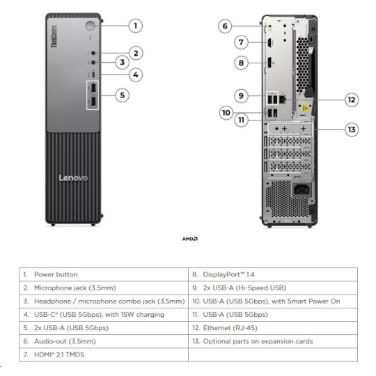 | Predné porty | 1x USB-C® (USB 5Gbps / USB 3.2 Gen 1), with 15W charging 2x USB-A (USB 5Gbps / USB 3.2 Gen 1) 1x headphone / microphone combo jack (3.5mm) 1x microphone (3.5mm) |