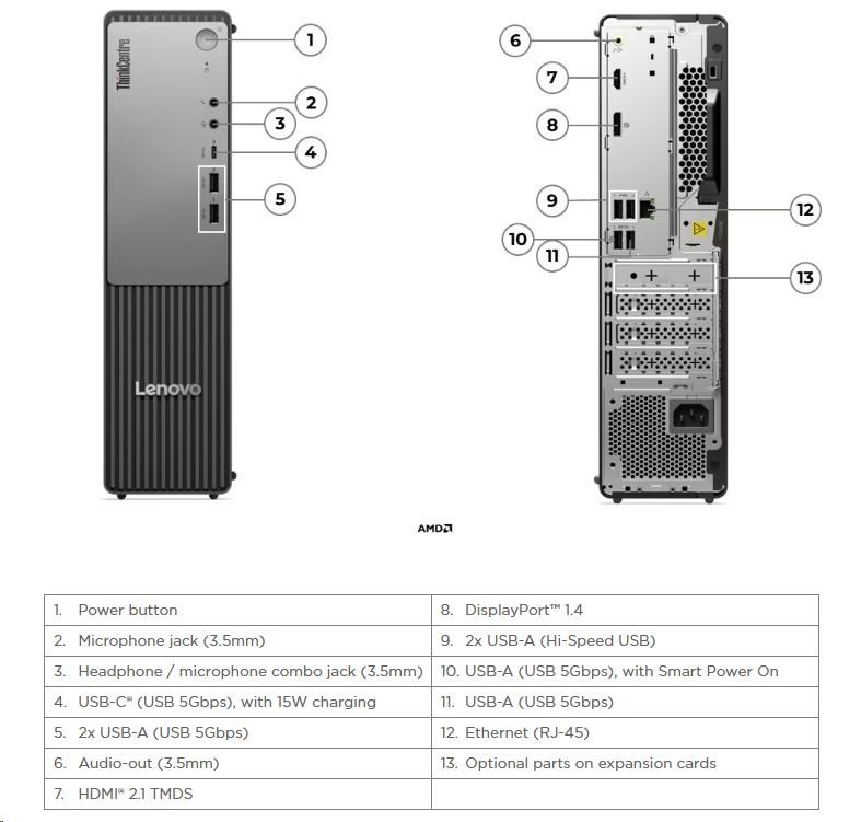 | Zadné porty | 2x USB-A (Hi-Speed USB / USB 2.0) 2x USB-A (USB 5Gbps / USB 3.2 Gen 1), one supports Smart Power On 1x HDMI® 2.1 TMDS 1x DisplayPort™ 1.4 1x Ethernet (RJ-45) 1x line-out (3.5mm) |