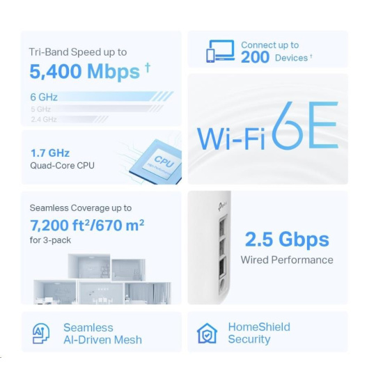 | Dosah WiFi | 3-4-izbové domy (2-pack) Technológia TP-Link Mesh Voliteľná Ethernetová backhaul spolupracuje na prepojení jednotiek Deco na zabezpečenie plynulého pokrytia AI-Driven Mesh Inteligentne sa učí prostredie siete pre ideálne Wi-Fi unikátne pre váš domov 4× vysokovýkonné antény (vnútri) Viaceré antény tvoria zosilňovací poľný rad na pokrytie väčšieho priestoru a smerov Tri-pásmové Nepretržitý 6 GHz pásmo prináša viac šírky pásma a rýchlejšie rýchlosti Fokusové žiarenie (Beamforming) Zameriava bezdrôtový signál na klientov na rozšírenie WiFi dosahu |
