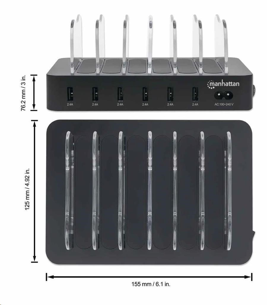 Prenosná elektronika s rozhraním USB kladie vysoké nároky na napájanie batérií a 6portová nabíjacia stanica Manhattan USB pomáha udržiavať vaše tablety, mobilné telefóny, digitálne fotoaparáty a ďalšie zariadenia nabité a pripravené na použitie. Táto nabíjacia stanica sa pripája do akejkoľvek štandardnej zásuvky a ponúka rýchle nabíjanie. Stanica s celkovým výkonom 50 W ponúka technológiu Smart IC na optimalizáciu nabíjania zariadení. Každý port podporuje až 5 V/2.4 A na rýchle nabíjanie smartfónov a iných prenosných zariadení. Okrem toho inteligentne chráni seba a vaše zariadenia pred skratom, prepätím, nadprúdom a prehriatím.