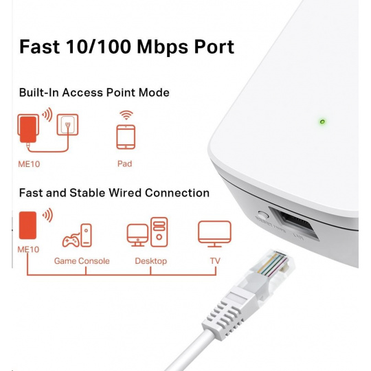 Nástenný extender signálu ME10 slúži na rozšírenie pokrytia Wi-Fi siete a posilnenie signálu existujúcej hostiteľskej siete. S rýchlosťami pripojenia až 300 Mbit/s môžete Wi-Fi sieť každý deň využívať na hranie online hier, sťahovanie veľkých súborov a sledovanie filmov na ľubovoľnom mieste v dome.