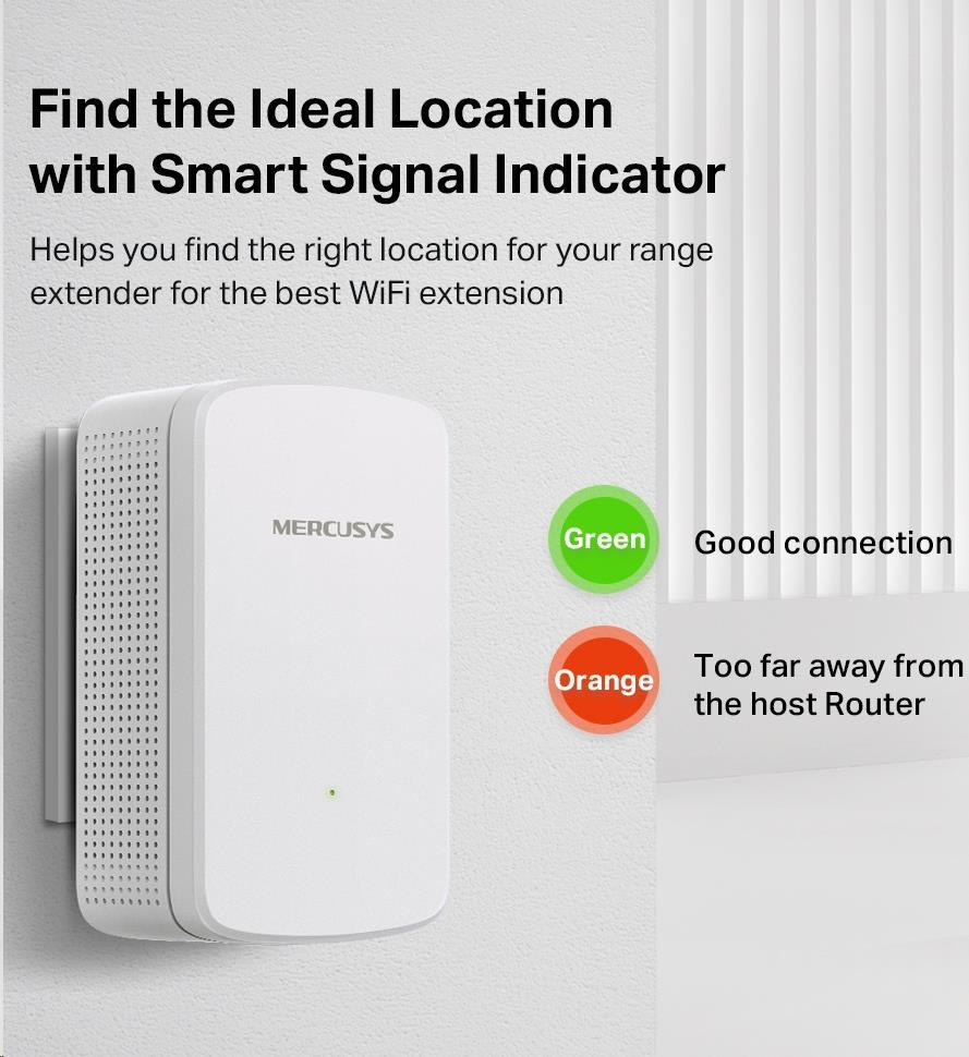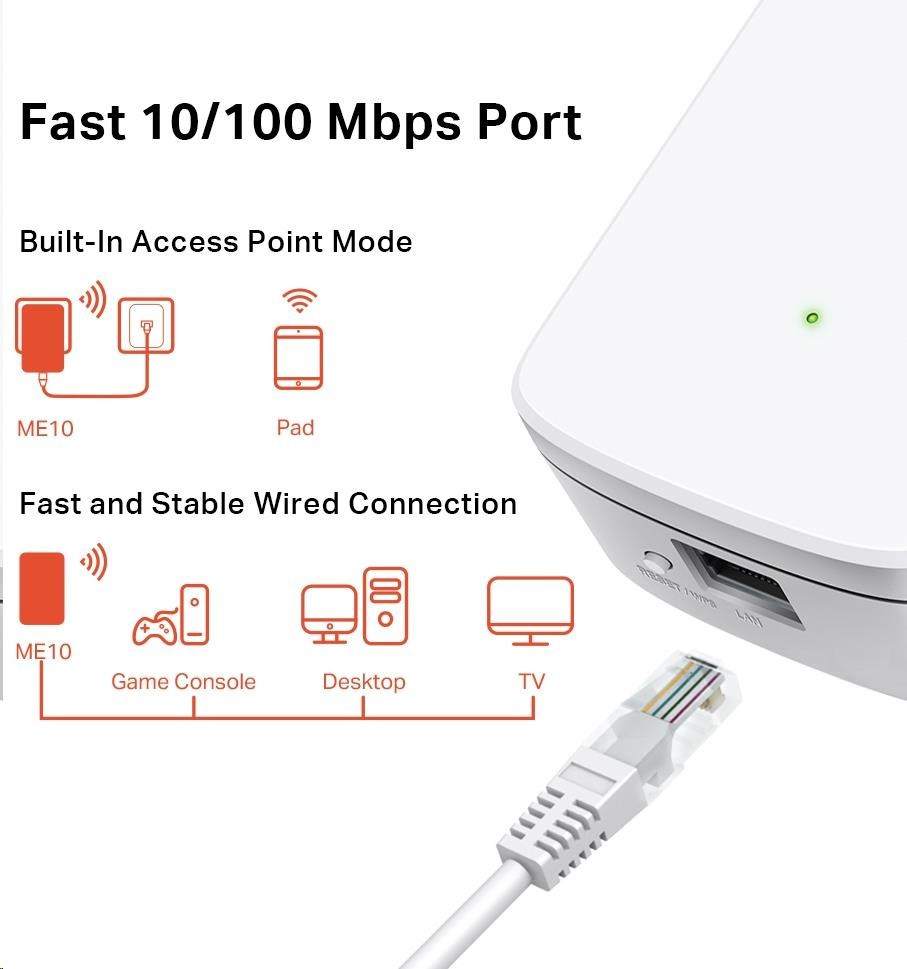 Nástenný extender signálu ME10 slúži na rozšírenie pokrytia Wi-Fi siete a posilnenie signálu existujúcej hostiteľskej siete. S rýchlosťami pripojenia až 300 Mbit/s môžete Wi-Fi sieť každý deň využívať na hranie online hier, sťahovanie veľkých súborov a sledovanie filmov na ľubovoľnom mieste v dome.
