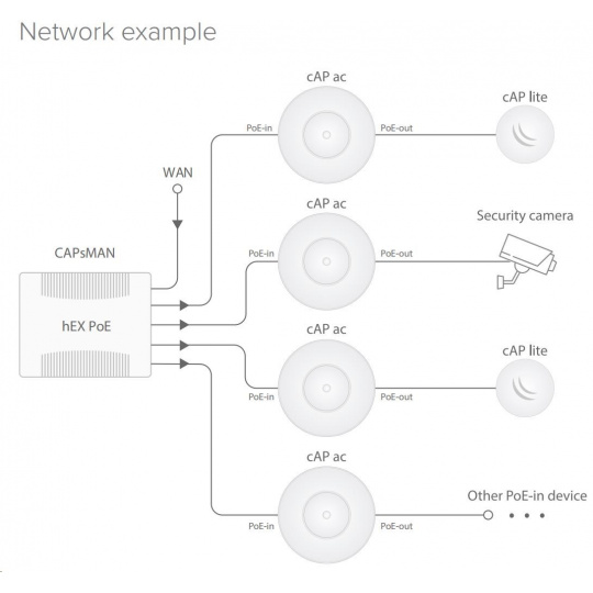cAP ac je dvojpásmový prístupový bod (2.4+5GHz) s podporou PoE podľa 802.3af/at. Má dve gigabitové.ethernetové porty, z ktorých prvý slúži ako napájací vstup (podporuje aktívne PoE 802.3af/at) a druhý ako výstup pre inú jednotku (podporuje len pasívne PoE do 57 V). Hoci jednotka podporuje režim opakovača, je možné pripojiť ďalší prístupový bod a ethenet.kábel do portu 2, kde bude napájaný pasívnym PoE, alebo môže byť pripojená IP kamera alebo iné IP zariadenie podporujúce pasívne PoE.