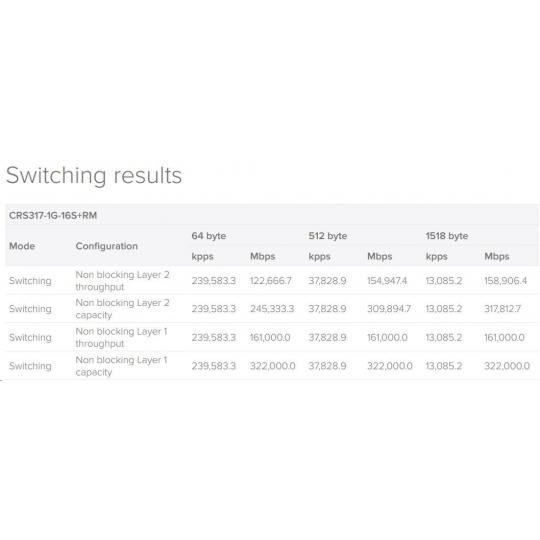 CRS317-1G-16S+RM je poháňaný novou generáciou čipov, ktorá poskytuje dostatočne vysoký výkon pre všetkých šestnásť portov 10G pri použití s ľubovoľnou veľkosťou ethernetového rámca. Nové funkcie, ako napríklad hardvérový protokol spanning-tree alebo Link Aggregation (LACP), poskytnú vašej sieti dostatočnú ochranu, spoľahlivosť a zvýšia jej úroveň na skutočne profesionálnu úroveň.