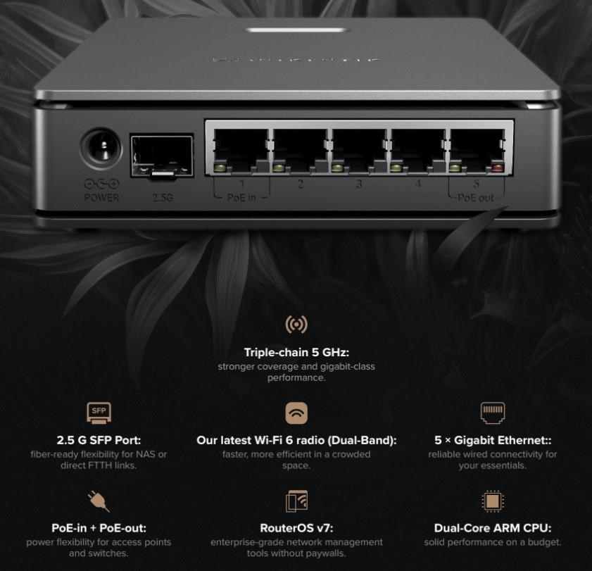 hAP ax S – nejvýhodnějším přístupový bod Mikrotiku s Wi-Fi 6. Levnější než většina sériově vyráběných wifirouterů střední třídy a přitom nabízí mnohem větší flexibilitu. Pod elegantním vnějším pláštěm se skrývá dvoujádrový procesor ARM, dvoupásmové Wi-Fi 6, USB, pět gigabitových ethernetových portů a 2,5 gigabitová SFP šachta. Můžete se připojit přímo k optickému kabelu nebo propojit vysokorychlostní NAS pro bleskurychlý místní přístup. Triple-chain 5GHz: klíč ke stabilnímu Wi-Fi v gigabitové třídě Nový hAP ax S je vybaven triple-chain 5GHz rádiem, které dosahuje reálné propustnosti kolem 800–900 Mbit/s. To znamená plynulé streamování, rychlejší stahování a stabilní výkon na více zařízeních. Je také ideální jako specializovaný přístupový bod Wi-Fi 6 VR pro streamování pro PC VR headsety, který nabízí vyšší rozlišení a nižší latenci bez kabelů. Na rozdíl od jednoúčelových „herních“ přístupových bodů vám hAP ax S nabízí plný výkon, flexibilitu a funkční budoucnost v stále zdokonalovaném RouterOS v7. Flexibilní napájení AP skýtá dvě možnosti napájení – přes DC konektor nebo PoE-in – dále integrován pasivní port PoE-out. PoE-out port využijete pro napájení dalšího zařízení MikroTik, jako je například další AP nebo kompaktní stolní switch. Vaše síť, Vaše pravidla Navzdory nízké ceně běží hAP ax S na plné verzi RouterOS v7, nejflexibilnějším síťovém softwaru na trhu. V době rostoucích výzev v oblasti zabezpečení dat a ochrany soukromí vám RouterOS poskytuje úplnou kontrolu – bez předplatného, bez upsellů, bez uzamčených funkcí. Ať už konfigurujete svou první Wi-Fi síť prostřednictvím aplikace MikroTik nebo budujete složité topologie, RouterOS v7 roste s vámi. VLAN, firewally, VPN tunely, tvarování provozu, skriptování, automatizace SMS – možnosti jsou neomezené. Například: můžete snadno izolovat zařízení IoT do samostatných podsítí, abyste ochránili svou domácí síť před nechtěným přístupem přes smart spotřebiče. Dodáváno s napájecím adaptérem 24V 1.5A v produktovém balení. Technické specifikace: Product code: E62iUGS-2axD5axT CPU: Dual-Core EN7562CT 950 MHz CPU architecture: ARM 32bit Size of RAM: 512 MB RAM type: DDR3 Storage: 128 MB NAND Number of 1G Ethernet ports: 5 Number of 1G SFP ports: 1 (2.5G supported) USB slot: 1 USB type A Switch chip model: EN7562CT Wireless: 2.4 GHz, 5 GHz Protocols: 802.11b/g/n/ax, 802.11a/n/ac/ax Wireless interface model: MT7916 MT7976 Number of chains: 2,4GHz - 2, 5GHz - 3 Antenna gain: 2,4GHz - 5.5dBi, 5GHz - 8dBi Dimensions: 156 x 127 x 36 mm Operating system: RouterOS v7, License level 4 Operating temperature: -40°C to +70°C Napájení Number of DC inputs: 2 (DC jack, PoE-In) DC jack input Voltage: 12-28 V PoE-In input voltage: 18-28 V Power adapter nominal voltage: 24 V Power adapter nominal current: 1.5 A PoE-In: Passive PoE PoE-Out: Passive PoE PoE-out ports: Ether5 Max out per port output (input < 30 V): 0.6 A Total output power: 16.8 W Max power consumption (without attachments): 11 W Max power consumption: 34 W Upozornění: Výrobce Mikrotik neposkytuje záruku na zařízení poškozená přepětím. Zařízení je třeba adekvátně chránit proti indukovanému elektrostatickému přepětí či přepěťovým špičkám na silovém vedení. Pro venkovní instalace používat výhradně stíněnou kabeláž (FTP/SFTP) a jednotky korektně uzemnit (prostřednictvím integrovaného zemnícího členu či použitím ethernetové přepěťové ochrany). Zařízení vždy provozujte s poslední výrobcem publikovanou verzí (výrobcem označenou "Stable") operačního systému RouterOS. Taková verze garantuje nejoptimálnější funčknost, obsahuje opravené chyby z verzí předchozích a výkonová vylepšení..