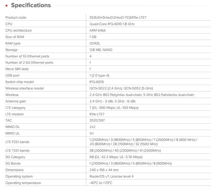 Chateau LTE7 ax si zachovává stejný výkonný hardware, elegantní design a výkon Wi-Fi 6. Nyní navíc nabízí modem LTE kategorie 7, rozšířenou podporu frekvencí a nižší cenu než předchozí verze LTE6 ax. Výkonný LTE router pro náročné sítě Chateau LTE7 ax kombinuje nový modem R11e-LTE7 s čtyřjádrovým procesorem ARM, 1 GB RAM, dvoupásmovým bezdrátovým připojením Wi-Fi 6 (802.11ax) a 2,5gigabitovým ethernetovým portem pro ultrarychlé lokální připojení. Umožňuje spuštění více zabezpečených VPN tunelů, pokročilá pravidla firewallu, pokročilá nastavení kontejnerů nebo složité scénáře směrování – to vše při rychlejším a spolehlivějším mobilním připojení. Ať už je LTE vaším primárním připojením nebo spolehlivou zálohou pro optické připojení, Chateau LTE7 ax se snadno přizpůsobí vašemu nastavení. Ideální pro domácí kanceláře, firmy a poskytovatele internetových služeb S pěti ethernetovými porty (včetně portu 2,5G!), 2×2 MIMO LTE a plnou funkčností RouterOS v7. Chateau LTE7 ax se hodí pro širokou škálu použití: • Zabezpečení domácích kanceláří a práce na dálku. • Malé a střední podniky. • Nasazení LTE nebo hybridních ISP. • Domácnosti, které vyžadují výkon a čistý design. Proč upgradovat na CAT7? • Dvojnásobná rychlost uploadu • Rozšířená podpora frekvencí – nyní zahrnuje pásmo 32 (1500 MHz) pro ještě lepší výkon v přetížených oblastech. • Stejný osvědčený design – žádné změny v instalaci nebo konfiguraci. • Nižší náklady – lepší konektivita, která ve skutečnosti stojí méně. Všechna nová zařízení CAT7 také podporují 2×2 MIMO DL a agregaci pásem. To znamená, že mohou současně využívat více pásem LTE. To je obrovská výhoda, když je v dané oblasti mnoho mobilních uživatelů. Nabízí lepší odezvu v přeplněném prostředí, vyšší účinnost v situacích se slabším signálem. Po zapnutí agregace pásem jsme zaznamenali zdvojnásobení rychlosti internetu ve venkovských oblastech. Vlastnosti Chateau je vybaven všemi pokročilými funkcemi RouterOS, takže získáte řešení podnikové úrovně za cenu spotřebitelské třídy. • využívejte zabezpečenou síť VPN z kanceláře přímo k vám domů • povolte nejrůznější druhy rodičovské kontroly • ponořte se do specifických pravidel brány firewall a hardwarové akcelerace IPsec • nakonfigurujte sítě VLAN, nastavte e-mailová nebo SMS upozornění • můžete automatizovat složitá spouštěcí oznámení (např: "VAROVÁNÍ!" pokud šířka pásma dosáhla hodnoty X po dobu trvání Y!) Podpora nasazení mobilními operátory Chateau podporuje technologii TR-069, která umožňuje vytvářet vlastní možnosti vzdálené správy klientů. Nejjednodušší a nejzákladnější nastavení routeru můžete mít na stejné webové stránce, kterou používáte k placení mobilního účtu. Technické specifikace: Product code: S53UG+5HaxD2HaxD-TC&R11e-LTE7 CPU: Quad-Core IPQ-6010 1.8 GHz CPU architecture: ARM 64bit Size of RAM: 1 GB RAM type: DDR3L Storage: 128 MB, NAND Number of 1G Ethernet ports: 4 Number of 2.5G Ethernet ports: 1 Micro SIM slots: 1 USB port: 1 (2.0 type A) Switch chip model: IPQ-6010 Wireless interface model: QCN-5022 (2.4 GHz), QCN-5052 (5 GHz) Wireless: 2.4 GHz 802.11b/g/n/ax dual-chain, 5 GHz 802.11a/n/ac/ax dual-chain Antenna gain: 2.4 GHz - 3 dBi, 5 GHz - 6 dBi LTE category: 7 (DL: 300 Mbps; UL: 100 Mbps) LTE modem: R11e-LTE7 TAC: 35312597 MIMO DL: 2x2 MIMO UL: 1x1 LTE FDD bands: 1 (2100MHz) / 3 (1800MHz) / 5 (850MHz) / 7 (2600MHz) / 8 (900 MHz) / 20 (800MHz) / 28 (700MHz) / 32 (1500 MHz) LTE TDD bands: 38 (2600MHz) / 40 (2300MHz) / 41 (2500MHz) 3G Category: R8 (DL: 42.2 Mbps; UL: 5.76 Mbps) 3G Bands: 1 (2100MHz) / 3 (1800MHz) / 5 (850MHz) / 8 (900MHz) Dimensions: 240 x 156 x 44 mm Operating system: RouterOS v7, License level 4 Operating temperature: -40°C / +70°C Napájení: Number of DC inputs: 1 DC jack input Voltage: 12-28 V Power adapter nominal voltage: 24 V Power adapter nominal current: 1.2 A Max power consumption without attachments: 15.5 W Max power consumption: 21.5 W Upozornění Výrobce Mikrotik neposkytuje záruku na zařízení poškozená přepětím. Zařízení je třeba adekvátně chránit proti indukovanému elektrostatickému přepětí či přepěťovým špičkám na silovém vedení. Pro venkovní instalace používat výhradně stíněnou kabeláž (FTP/SFTP), jednotky korektně uzemnit (užití integrovaného zemnícího členu, ethernetové přepěťové ochrany). Zařízení vždy provozujte s poslední výrobcem publikovanou verzí (výrobcem označenou "Stable") operačního systému RouterOS. Taková verze garantuje nejoptimálnější funčknost, obsahuje opravené chyby z verzí předchozích a výkonová vylepšení..
